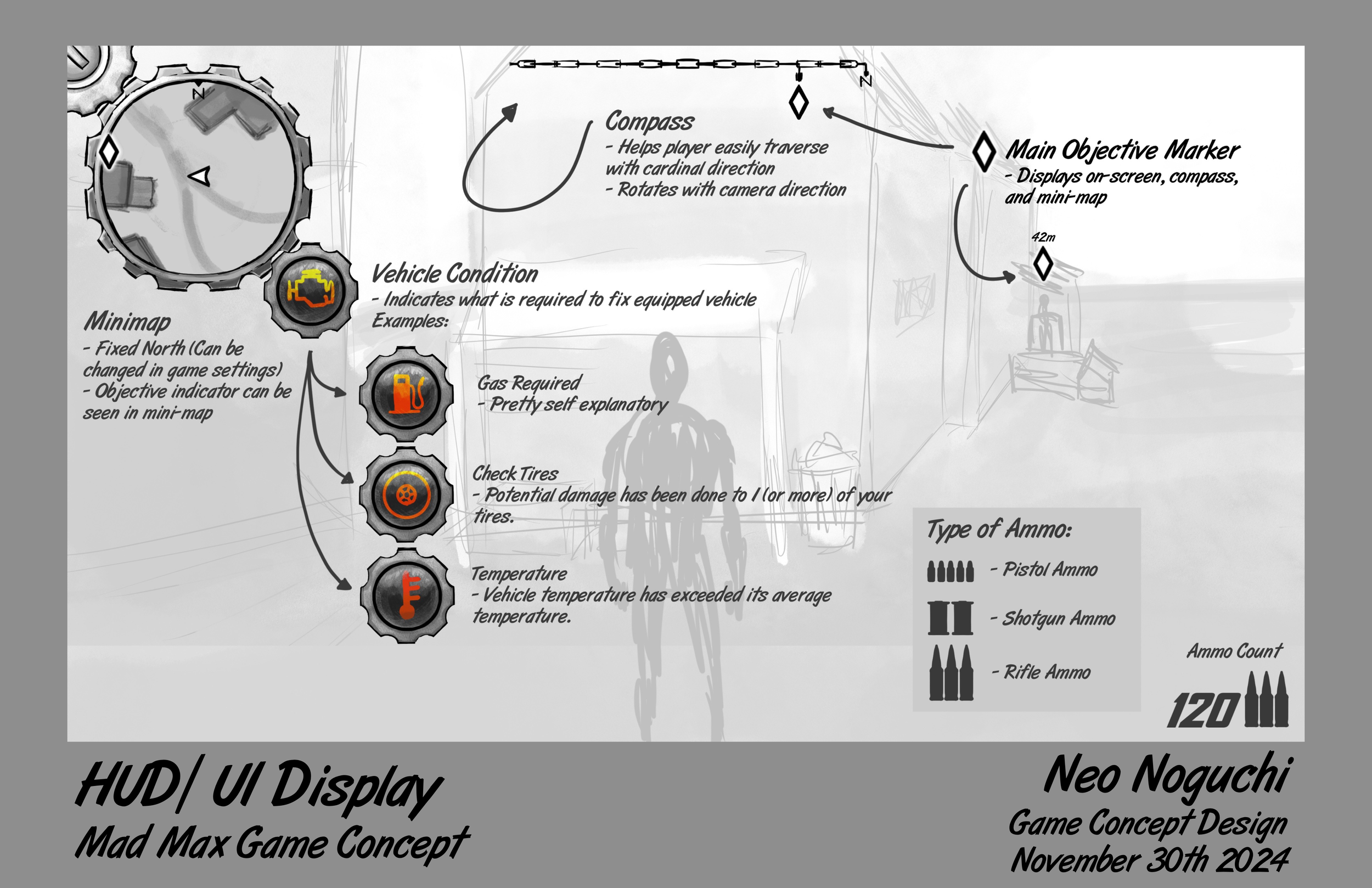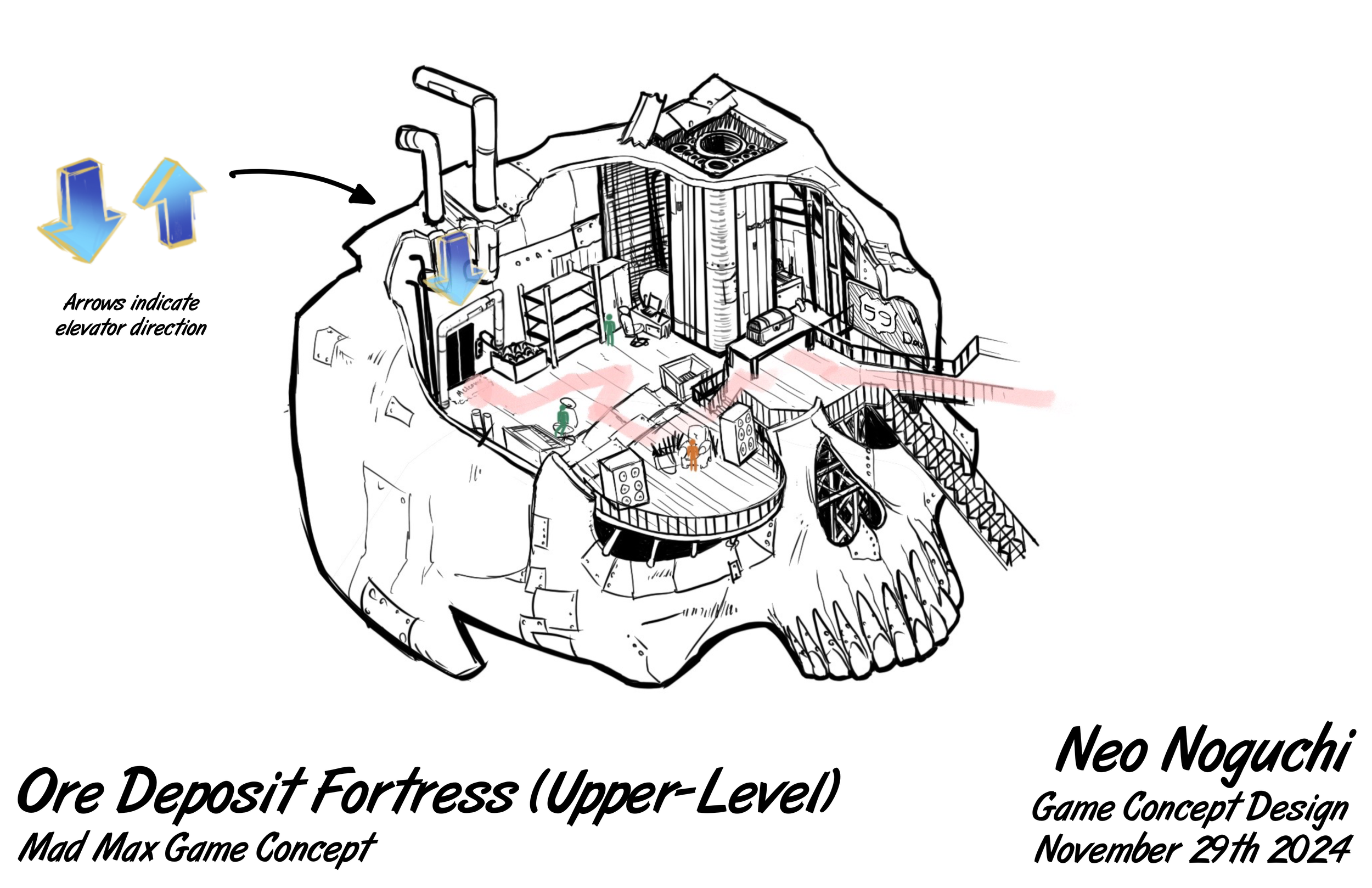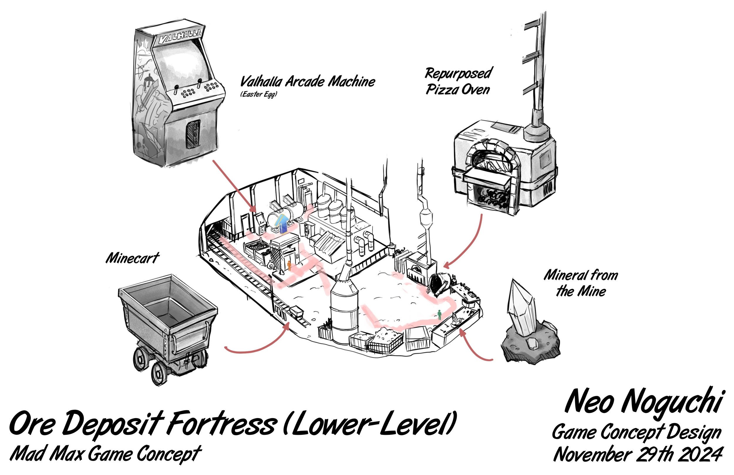 This is my most recent project that I’ve done of this scale. It was a class project, the exploration of the Mad Max world where we each chose a resource to build our level around. I chose to have ores as my resource as my location was a city of mines. We explored character design, map design, prop design, vehicle design, and so much more from this project.
